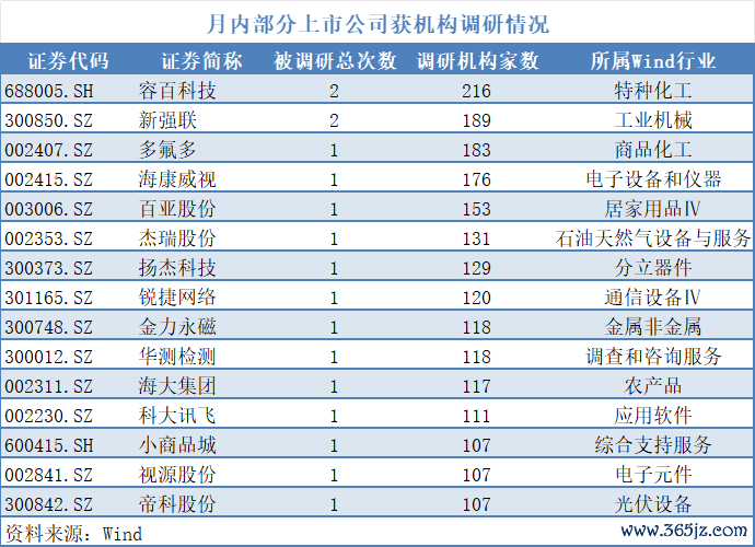15家A股公司月内获调研超百次