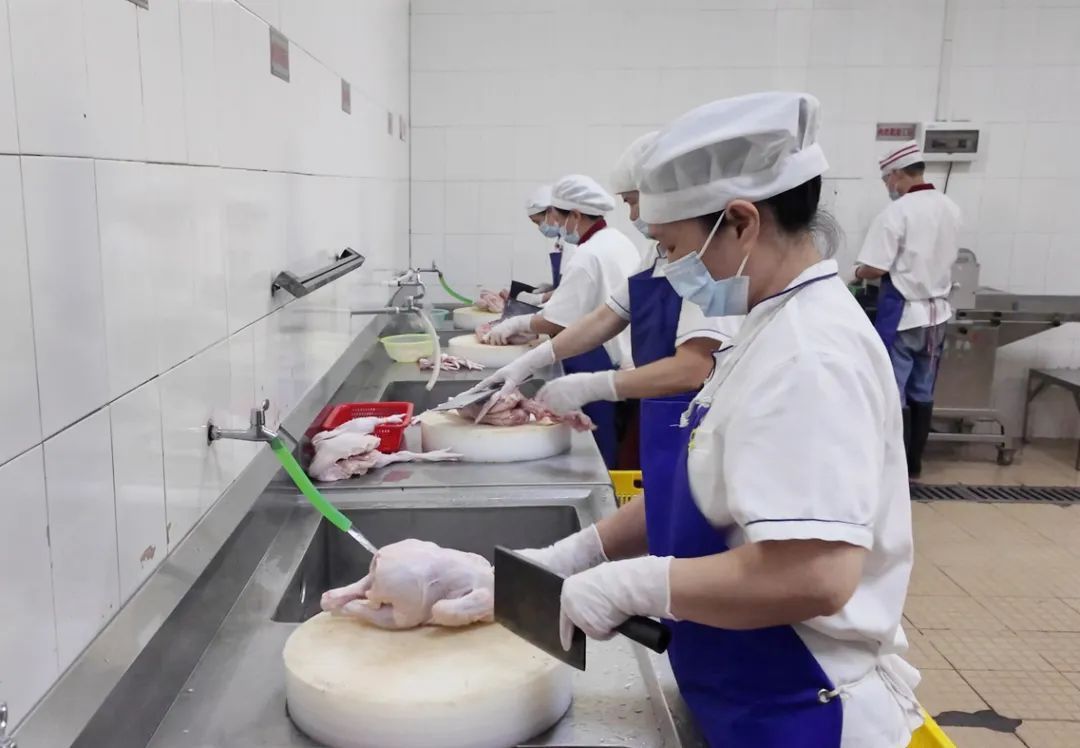 走进纪元中学食堂后厨,映入眼帘的是锃亮的不锈钢操作台,身着统一工作服的后厨工作人员,正戴着口罩和卫生帽,熟练地切配食材、烹饪菜肴。